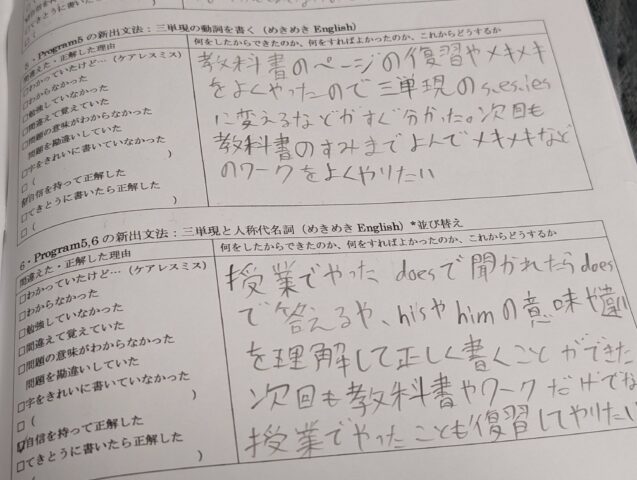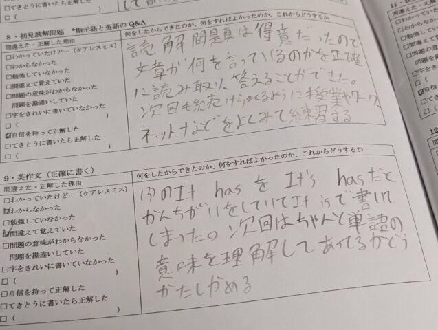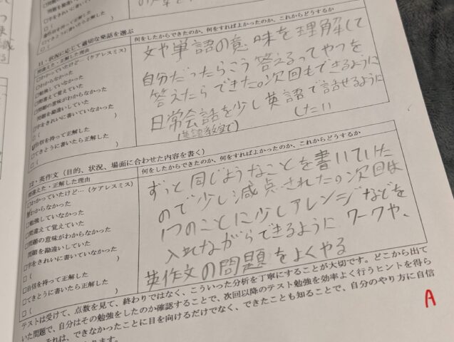 定期考査が終了したあとに、英語では「振り返りシート」を記入して提出します。第二回の定期考査後に出したこの振り返りシートの完成度の低さに絶句したのは約三ヶ月前。しつこいようですがこんな感じ。